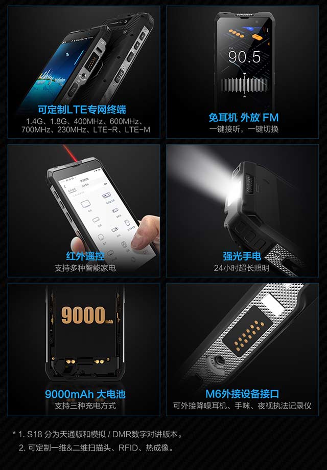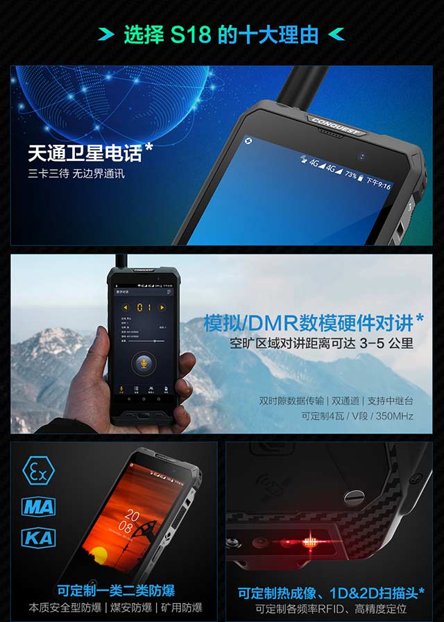 CONQUEST conquers the S18DMR intercom handheld terminal is our latest triple-play intelligent large-screen handheld terminal (that is, it can flexibly choose public network communication, private network communication or DMR / PDT intercom communication). This product adopts dual SIM card design, supports private network bands such as 1.4G and 1.8G, as well as public network GSM, UMTS and LTE standards and frequency bands, ensuring public network integration and multi-network collaboration; compatible with DMR / PDT intercom, and supporting WIFI 2.4G And 5G dual frequency, Bluetooth 5.0, NFC function; support GPS, Beidou, GLONASS, Galileo joint positioning. In the emergency communication system, CONQUEST S18 can flexibly choose public network communication, private network communication or DMR / PDT intercom communication to ensure smooth communication from the scene of the accident to the forward command. It can be used in corporate / government office, military security, rescue Disaster relief, coal mining, port shipping, power chemical industry, airport tunnels and other special industries.
