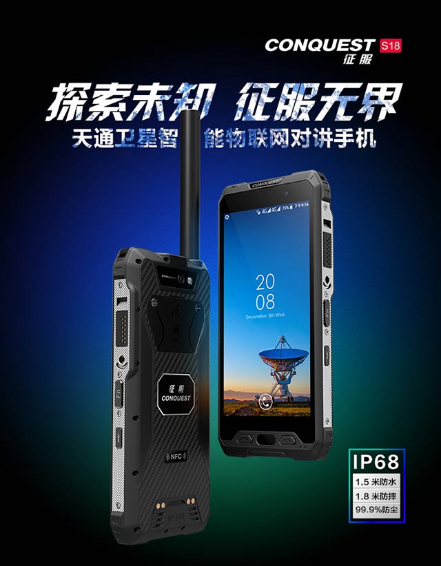 2020年1月份,深圳市康凯思特通讯设备有限公司为配合中国电信天通卫星业务特推出征服(CONQUEST)S18天通卫星手机,是一款支持卫星通话的手机,突破了以往卫星手机配置性能的短板,搭载了八核2.3GHz处理器,具备内外IP68级的三防能力,6G运行内存和128G存储内存还支持最大2TB扩展卡,BOX音腔喇叭等等。更重要的是,S18搭载的正是我国自主知识产权的天通卫星通话技术,向着卫星通话全民化迈出了一大步。