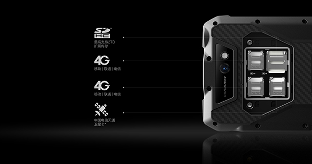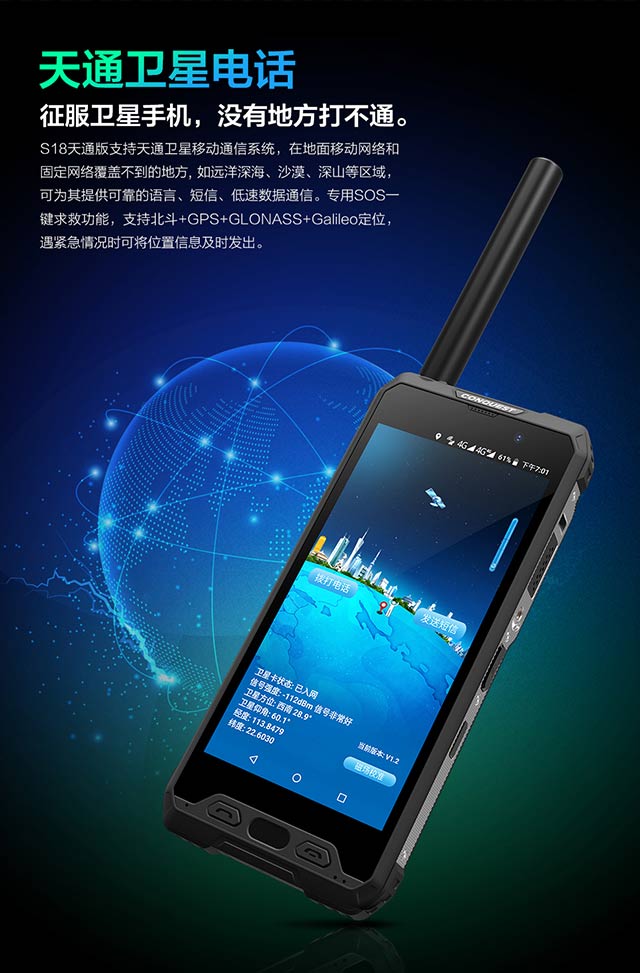 CONQUEST S18天通版通讯功能强大在于,即使周围没有移动、联通、电信三家运营商的GPS信号,也可以通过连接天通卫星信号进行通话和发送短信。