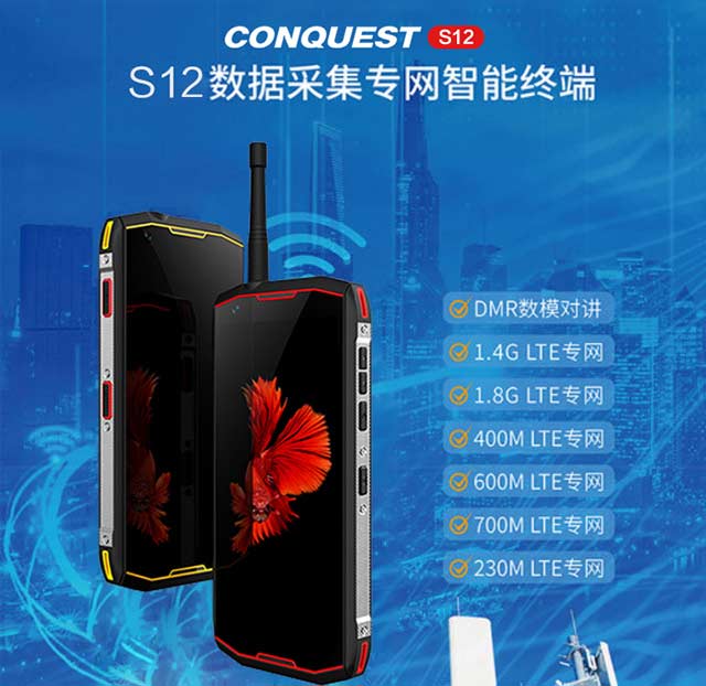 CONQUEST征服 S12工业防爆手机除了支持POC无线网络对讲,还支持DMR数模一体硬件窄带专网对讲,支持400MHZ-450MHZ对讲频段。是遨游品牌第一款DMR数模一体对讲三防智能通讯终端,支持LTE 4G通信、数字对讲、模拟对讲、POC公网对讲手机,采用八核处理器、5.99英寸FHD+(2160*1080)高清分辨率。八核2.5GHZ处理器、支持6G+128G机身存储,可扩展512GB内存。原生安卓ANDROID8.1操作系统,4G双VOLTE技术可同时通话上网。2100万后置摄像头、专业F/1.8大光圈、PDAF相位对焦。不仅可以拍出高清照片,还可进行水下拍摄,光线阴暗地区拍照等。