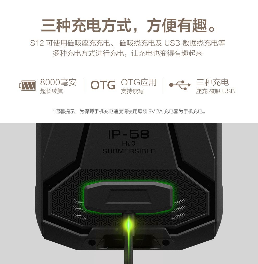在户外,只有三防手机才能让用户畅游无忧。因为户外下雨天和潮湿的天气都容易让手机“罢工”,所以防水是户外手机的第一关。三防智能手机征服conquest S12拥有IP68防护级别,能1.5米防水,1.5米多角度防摔。S12内置有GPS+BDS北斗(默认)或GPS+GLONASS格洛纳斯双模定位,独立工业级硬件定位芯片加独立工业级有源天线,支持离线定位,在无卡无信号的情况下也能实现精准坐标定位,在沙漠、海洋等无参照物状态下,还能开启航点导航系统。有征服S12在手,不论是落到哪个荒郊野岭,也能够轻易找到你!S12的电池容量达8000毫安,采用高容高压聚合物电池,并支持USB直充+座式充电+磁吸充电三种方式,通过配备的9V 2A充电器直充,充满8000毫安也只需四小时。S12拥有海拔气压针、指南针、手电筒、心率监测、警铃、SOS、放大镜、铅锤、量角器、挂图器、水平仪、噪音测试等实用户外功能,给户外出行带来更多保障与乐趣!对于户外爱好者来说,它能防水、防摔、防刮,信号也表现不俗,而且续航能力超强,实打实的户外小帮手。