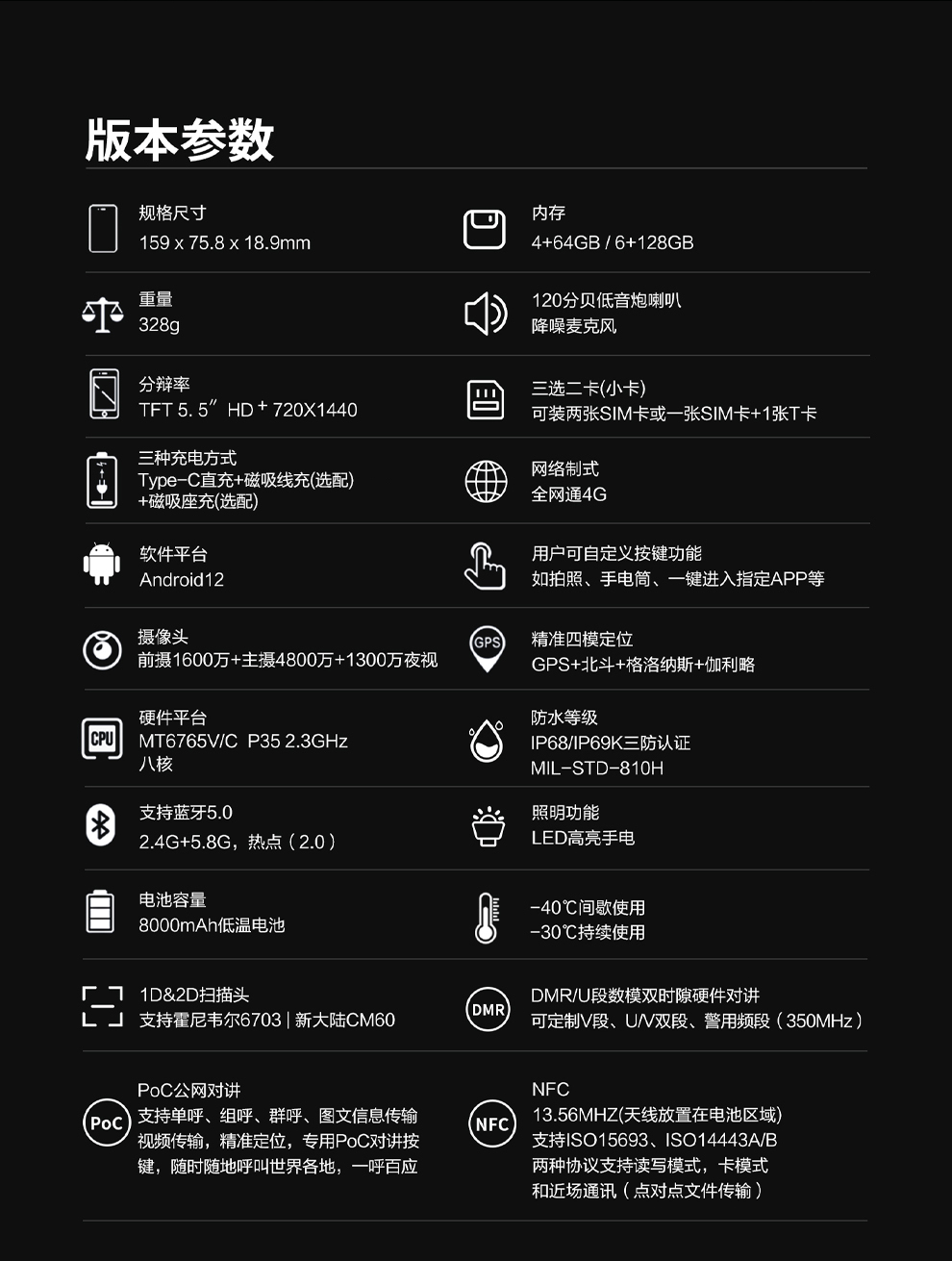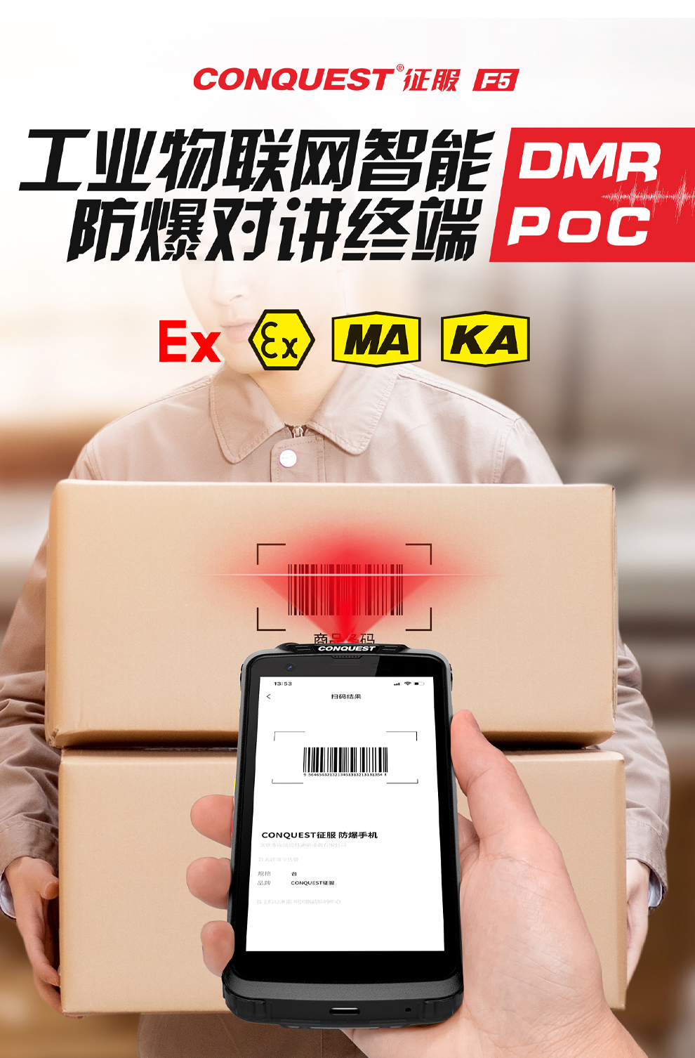 CONQUEST征服F5工业物联网智能防爆对讲终端,智能防疫核验手持终端,DMR数模对讲、一二维扫码、红外夜视摄像、8000mAh电池。