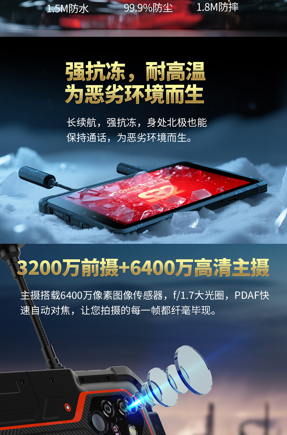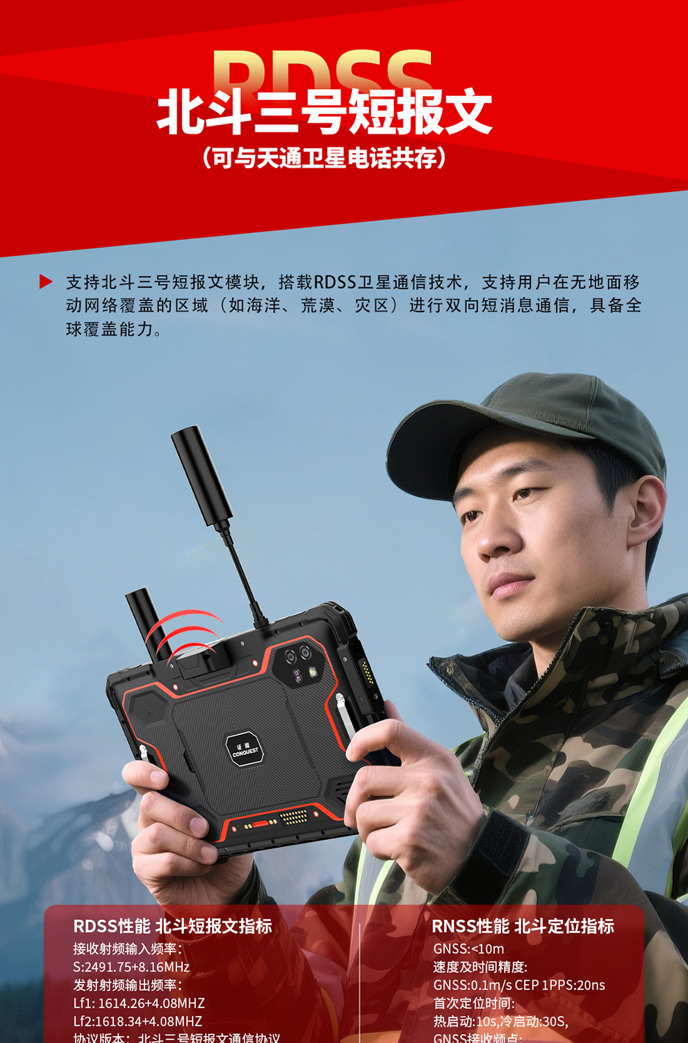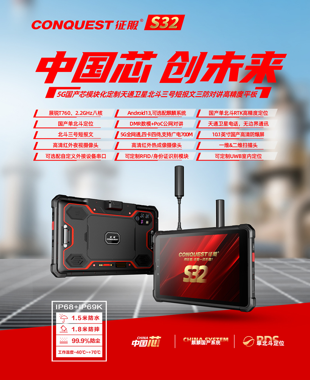 CONQUEST征服S32首款北斗短报文+天通卫星通讯+DMR对讲,5G单北斗高精度定位防爆平板终端!