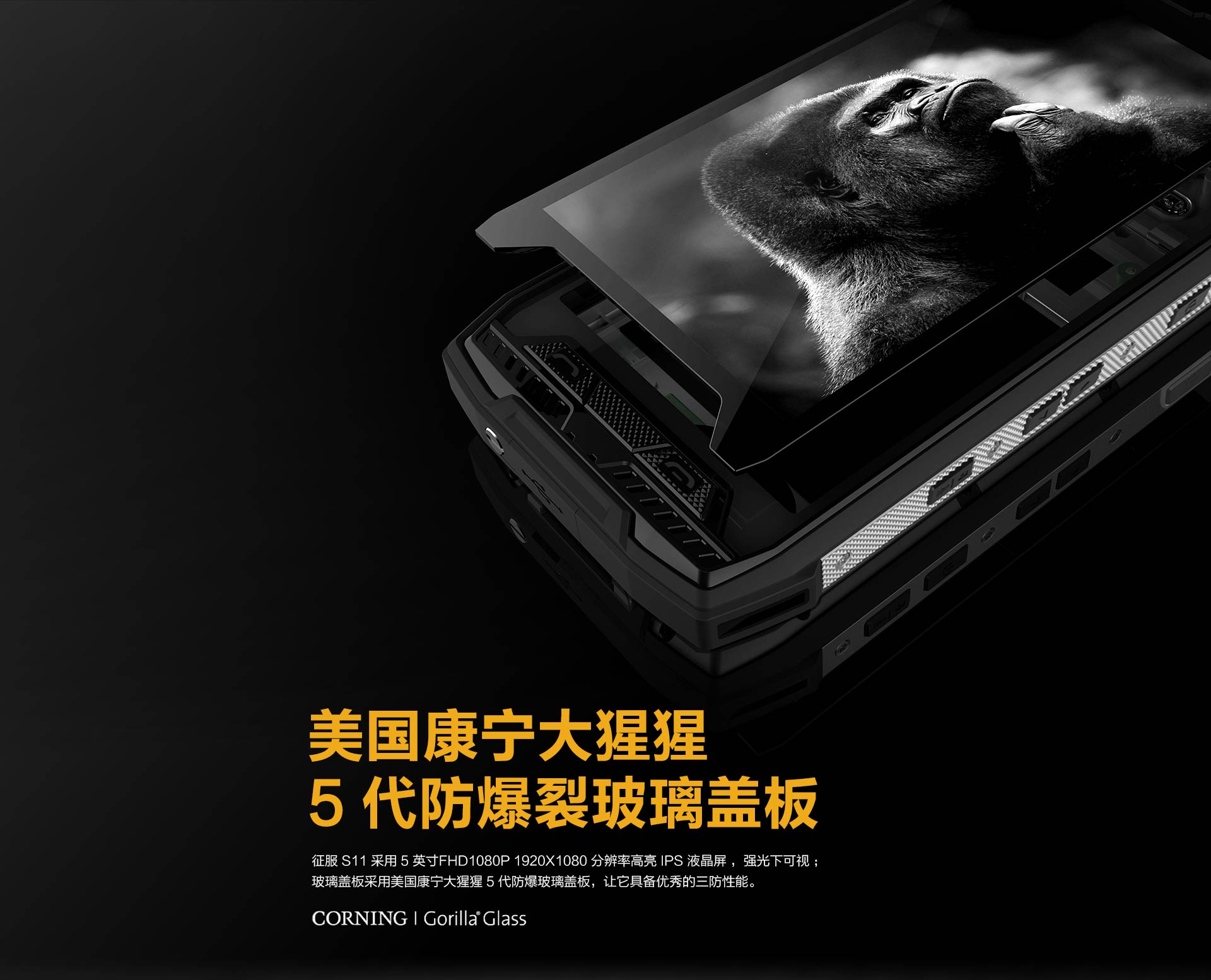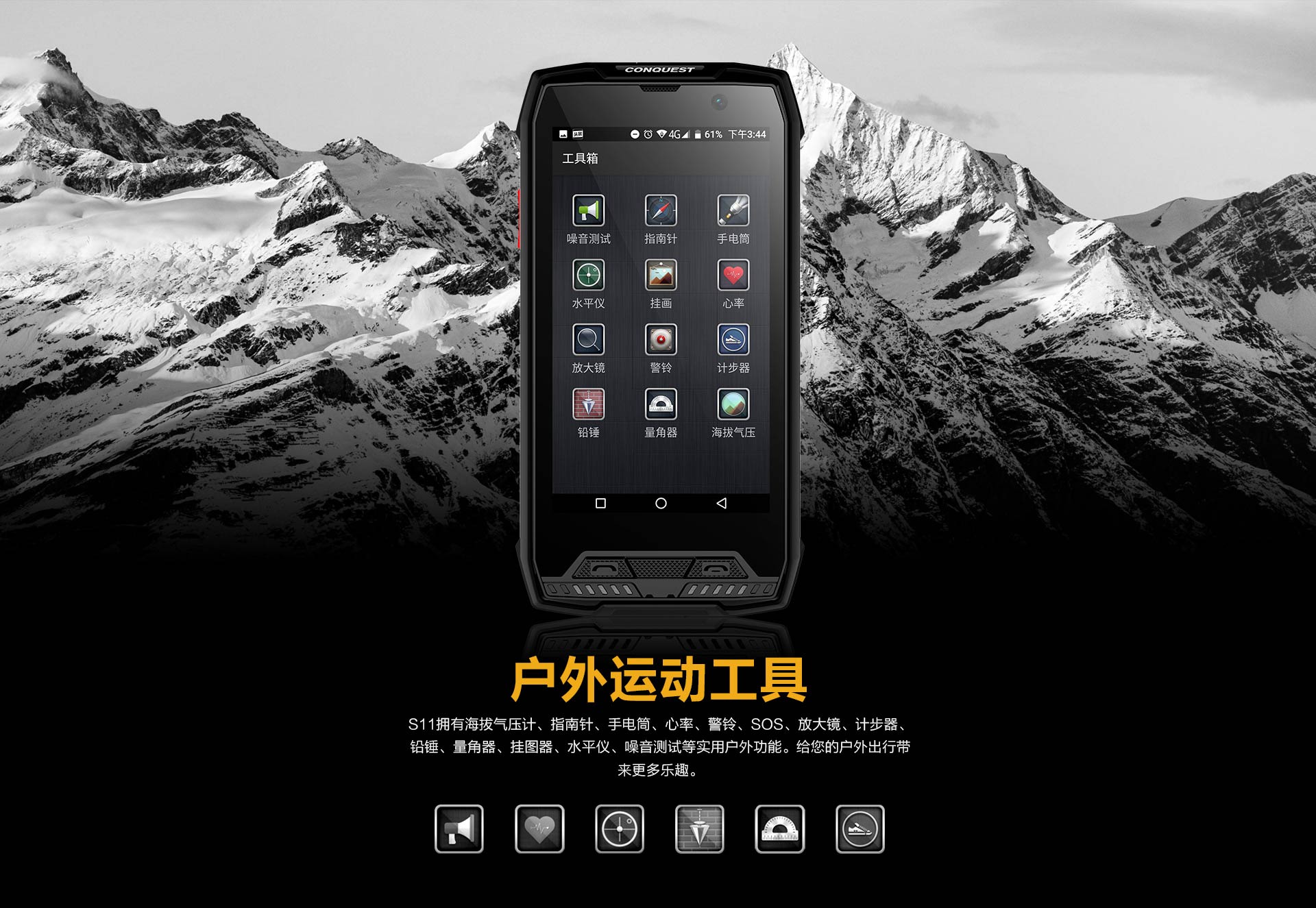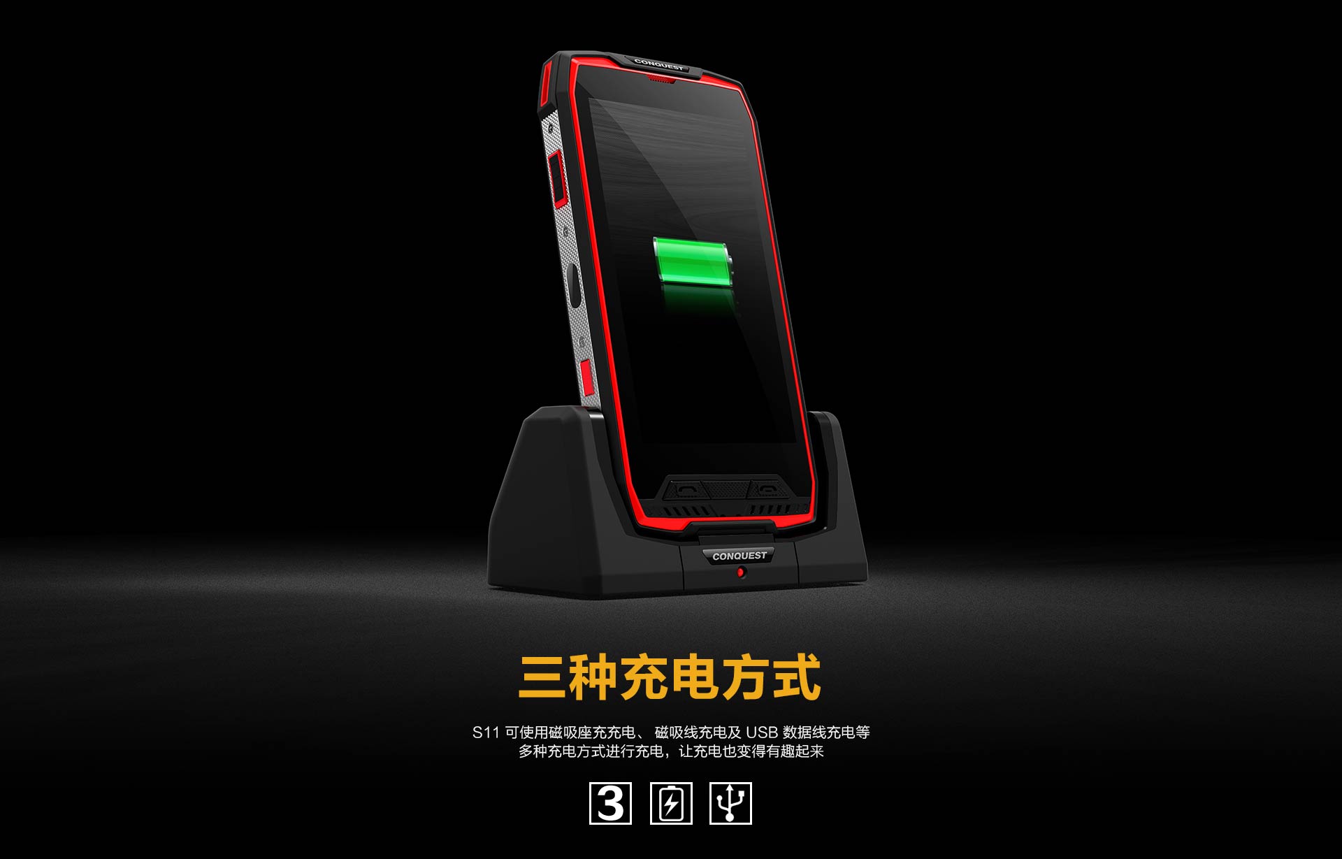 CONQUEST 征服 S11对讲防爆手机 2.6G八核CPU,ROM128GB+RAM6GB,5寸FHD1080P1920X1080分辨率高亮IPS液晶屏,强光下可视!美国康宁4代防爆裂玻璃盖板,前置1300万后置1600万高清摄像头,蓝宝石摄像头镜片,原生安卓7.1.1系统。