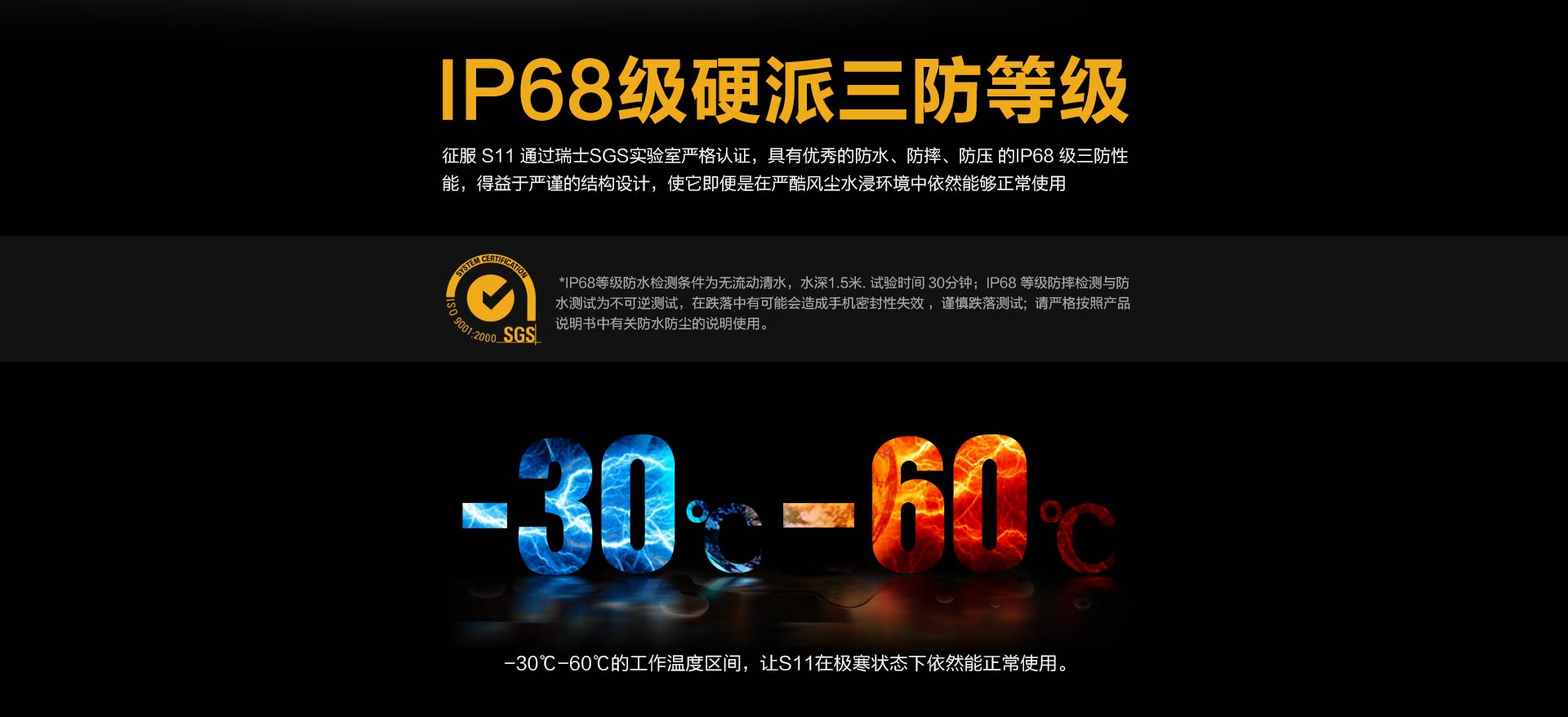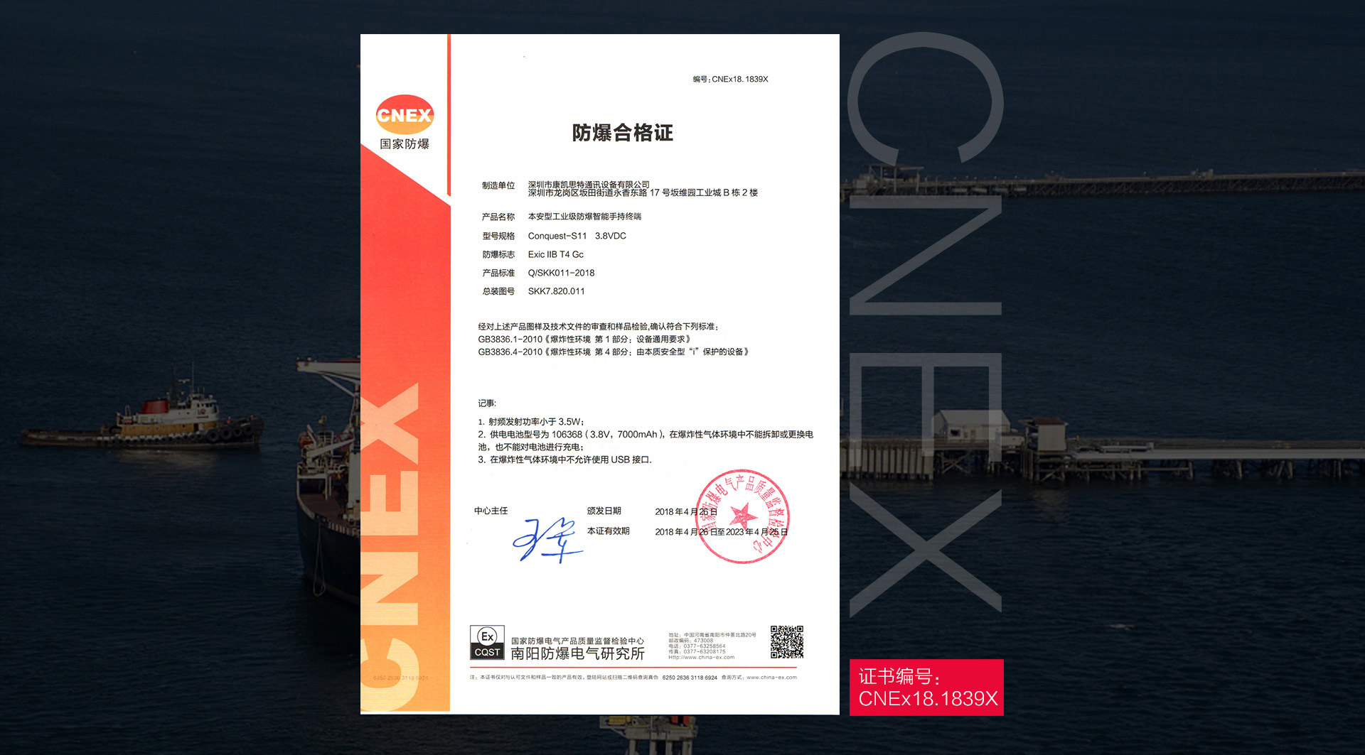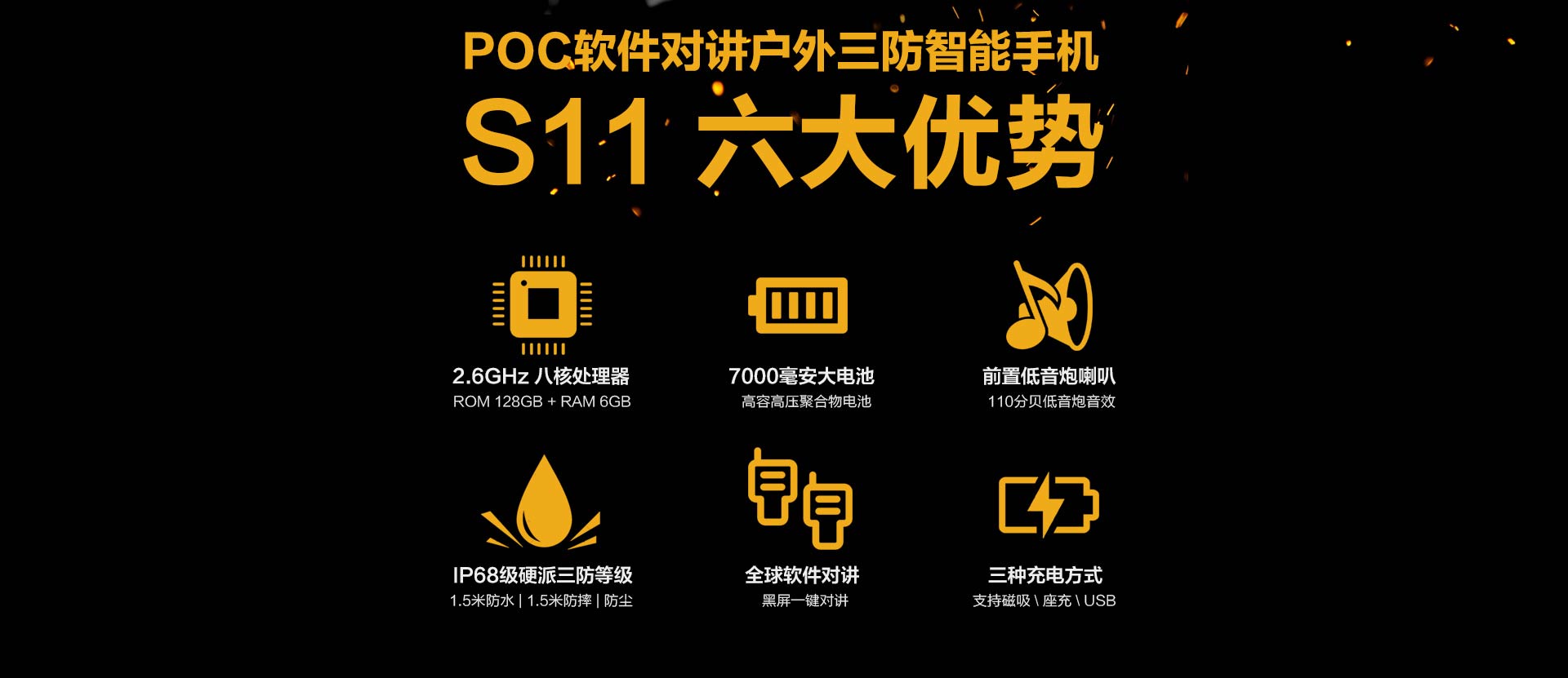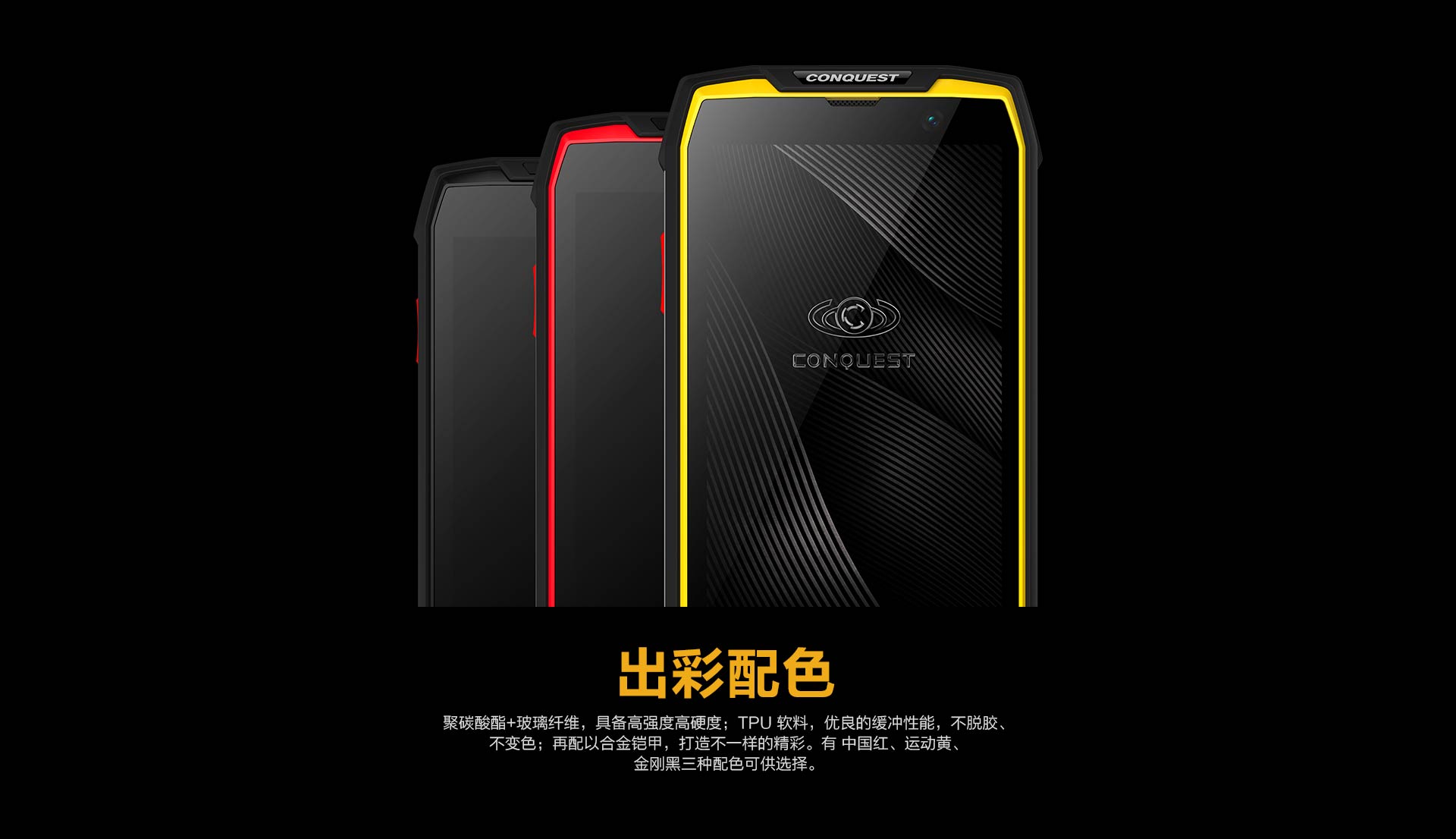 CONQUEST 征服 S11对讲防爆手机 2.6G八核CPU,ROM128GB+RAM6GB,5寸FHD1080P1920X1080分辨率高亮IPS液晶屏,强光下可视!美国康宁4代防爆裂玻璃盖板,前置1300万后置1600万高清摄像头,蓝宝石摄像头镜片,原生安卓7.1.1系统。